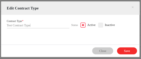 - On the “Edit Contract Type” page, users can rename the “Contract Type” or change the status from Active to Inactive.