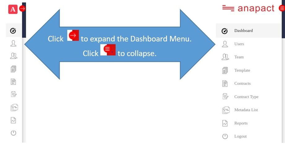Anapact features menus with specific icons that can help users to easily navigate the system. To access the Dashboard Menu, simply hover to the left corner of the Dashboard Page where several icons are displayed.